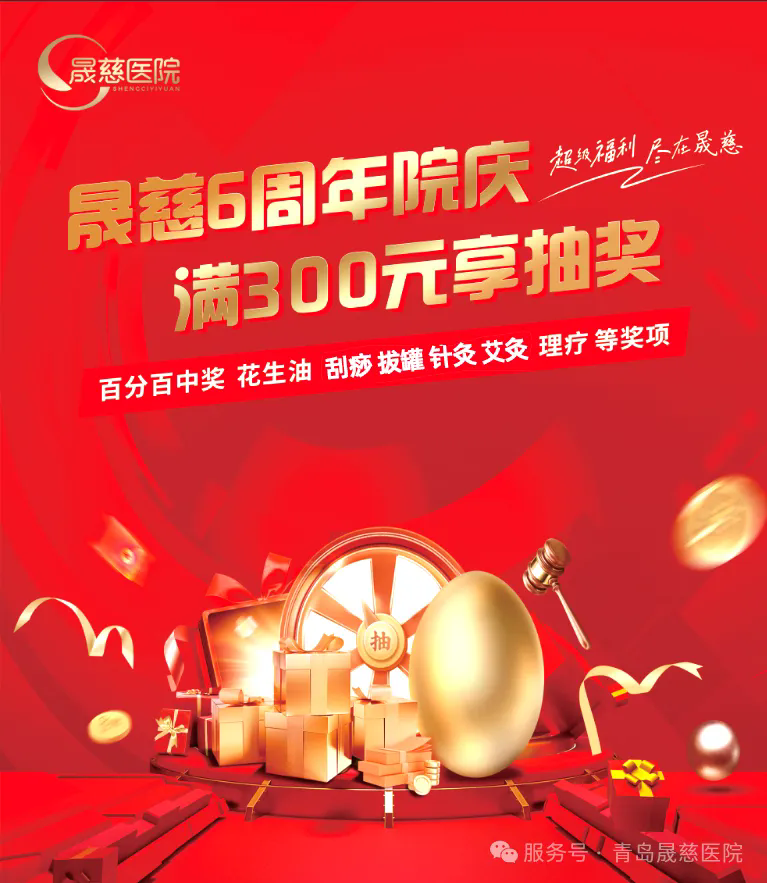时光匆匆,转眼间青岛晟慈医院已经陪伴大家走过了六个年头。六年来,我们始终坚守初心,致力于为每一位患者提供优质、高效、温暖的医疗服务。值此 6 周年院庆之际,我们精心准备了抽奖活动,回馈广大患者和市民的支持与信任,让您在这个特殊的日子里,收获满满的健康与福利!